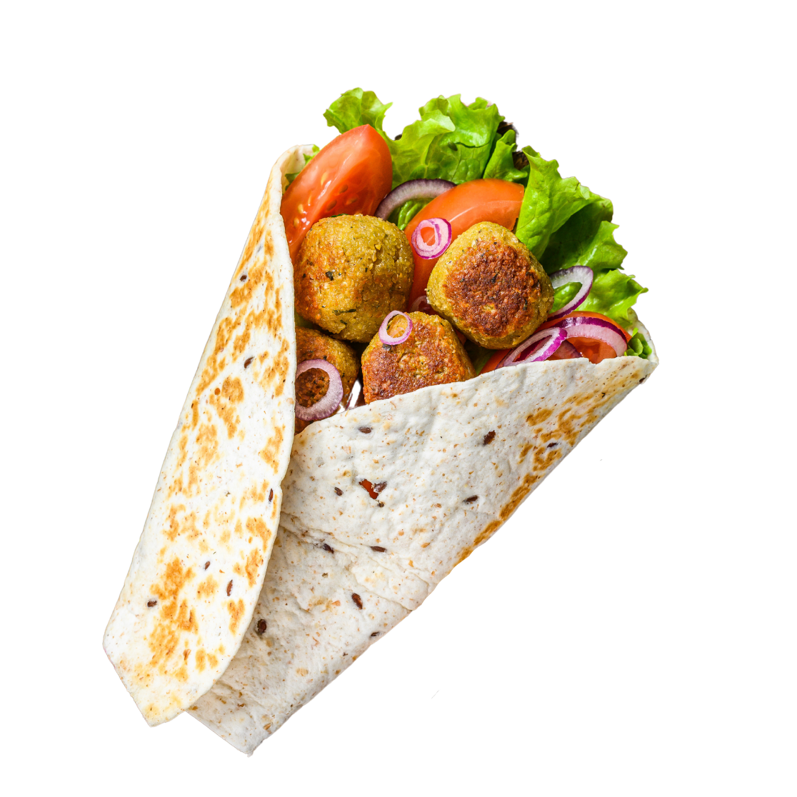 falafel, papryka, pomidor, sałata lodowa, ogórek, sos